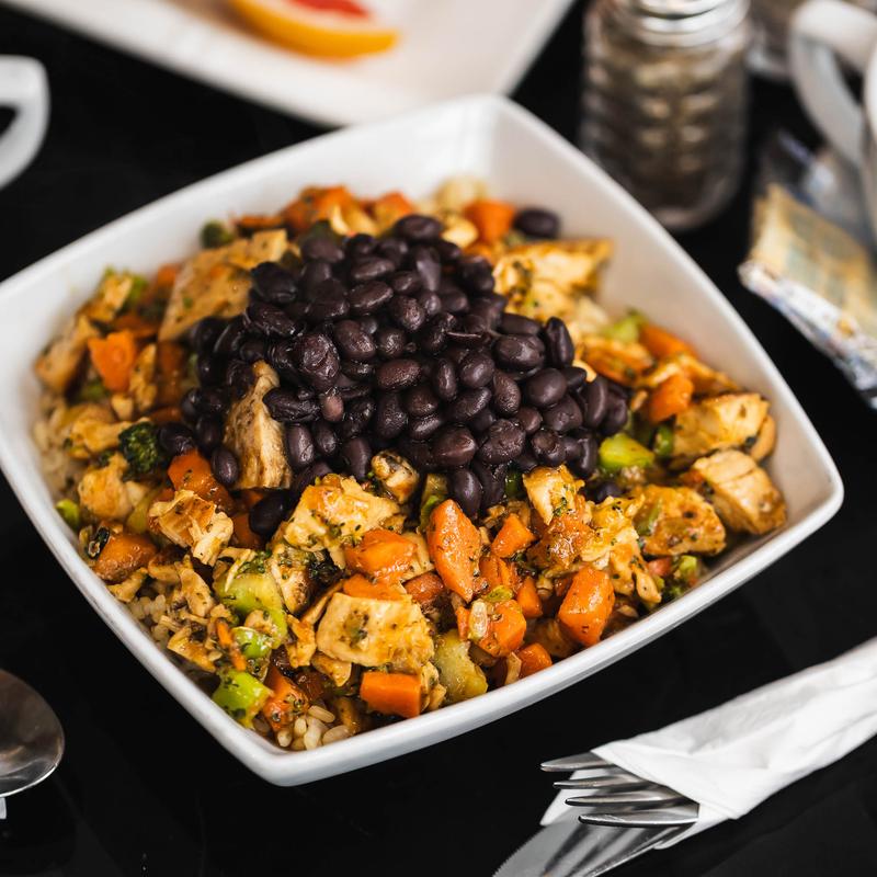 6 oz. teriyaki chicken, broccoli, carrots, squash, all diced-up and served over brown rice & black beans • Try it with beyond meat +$3.00