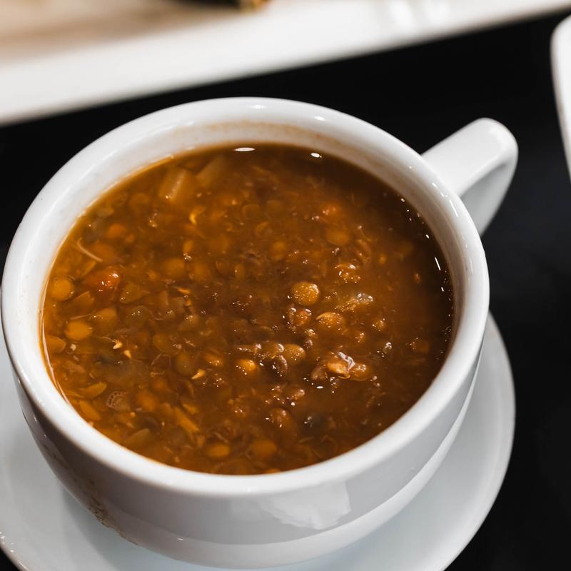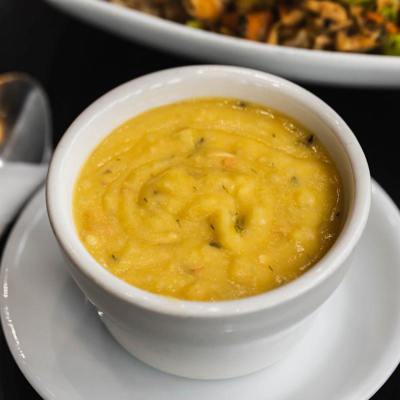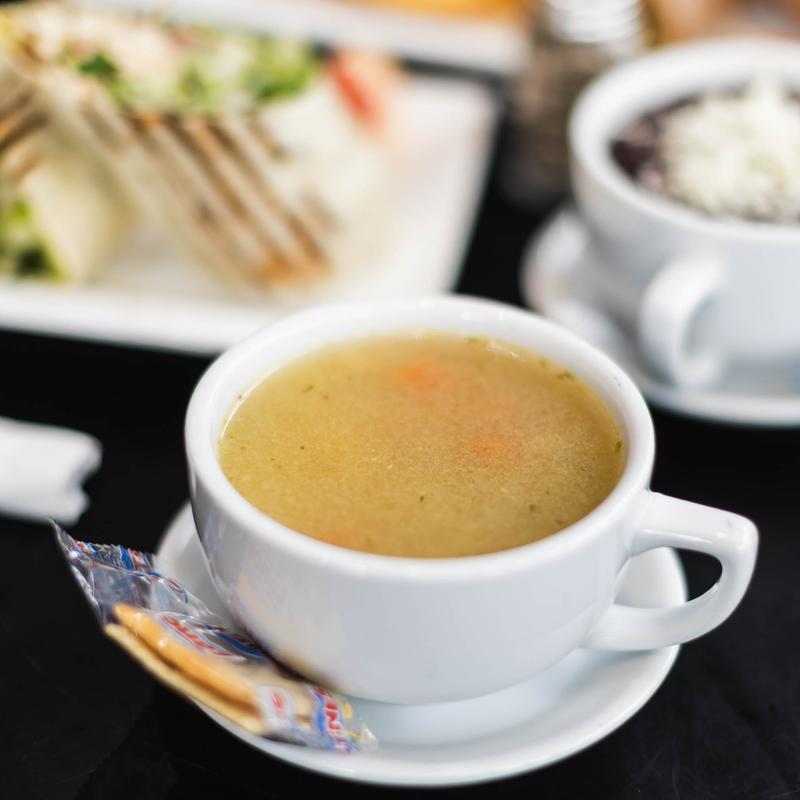 Mini chicken protein meal with small soup, brown rice, pico de gallo, honey mustard dipping sauce & lemon wedge.