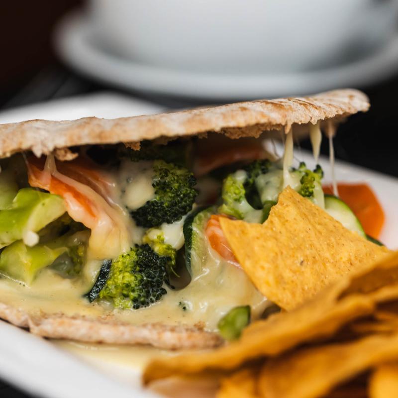 Homemade hummus, cucumber, sliced tomato, avocado and sprouts, served on whole wheat flatbread.