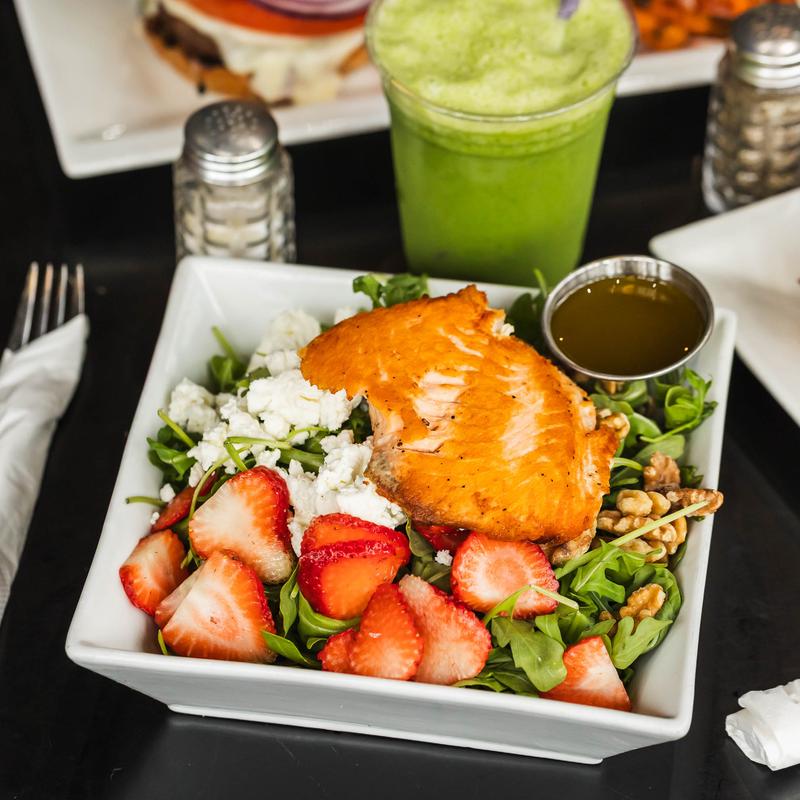 Arugula, grilled salmon, goat cheese, walnuts, strawberries, oil, lemon dressing.